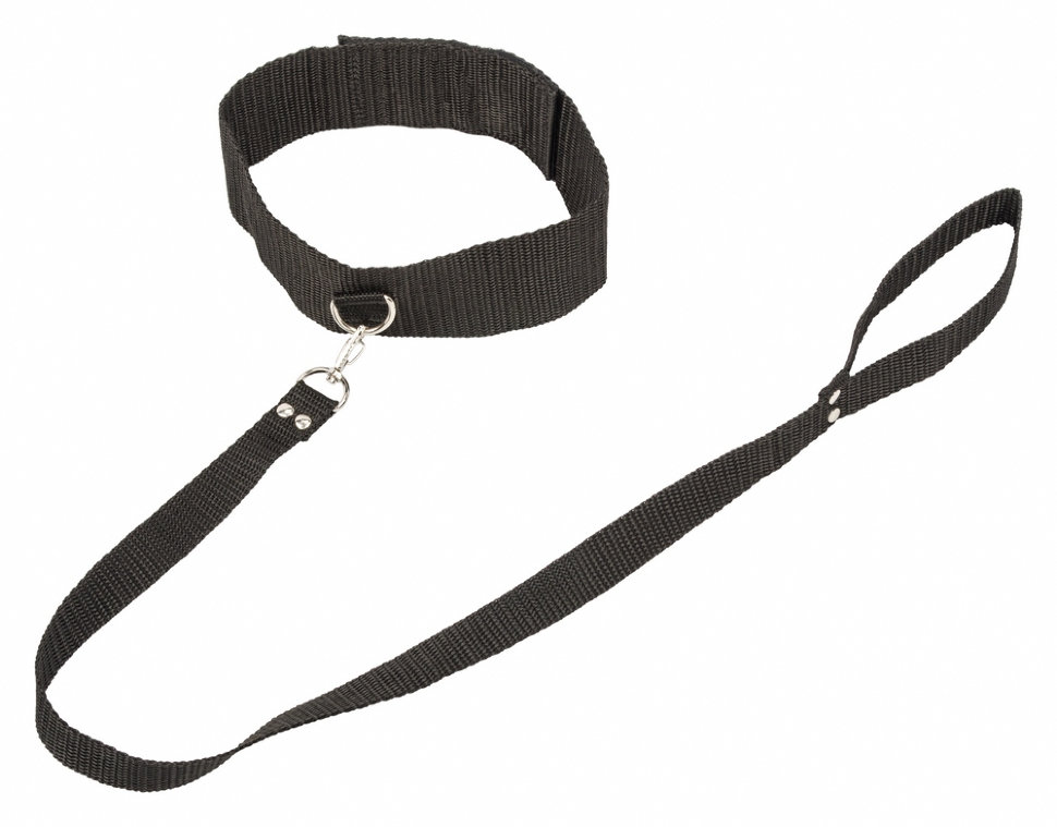 Черный ошейник с поводком. Приятный материал ошейника нежно обвивает шею и легко регулируется до нужного размера, а с помощью поводка вы сможете контролировать движения партнера. Ширина ошейника- 5 см, длина ошейника- 44 см, ширина поводка- 2 см, длина поводка- 75 см. Упаковка картонная коробка с принтом. Производитель: Lola Toys Bondage Collections