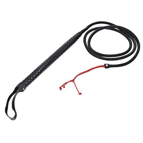 Длинный плетеный кнут с петлей на рукояти. Благодаря плетению полос искусственной кожи она не скользит в руке, длина рукояти 34 см, длина тугого кнута вместе с красным наконечником 185 см.