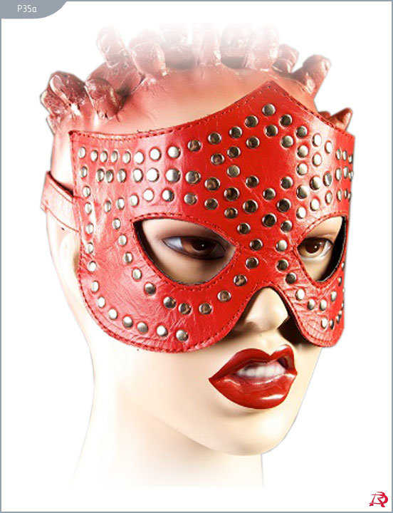 Маска–очки профурнитуренная заклепками на кожаной красной подкладке. Ручная работа. Длина изделия — 68 см, ширина — 13,5 см. Максимальный обхват — 64 см, минимальный — 55 см