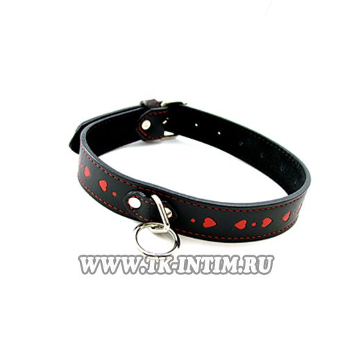 Ошейник узкий декорированный красными сердцами. Может использоваться также как стильное украшение или подарок послушной рабе. В комплекте цепочка поводок. Размер универсальный.