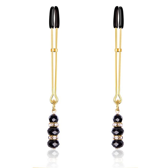 Зажимы для сосков или половых губ - золотистая пара зажимов с кристаллами черного и хрустального цвета. Степень сжатия можно регулировать с помощью колечка.