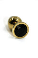 Золотая анальная пробка из алюминия маленького размера. Страз в основании круглой формы, выполнен из стекла цветного цвета. Упакована в вельветовый мешочек для хранения.